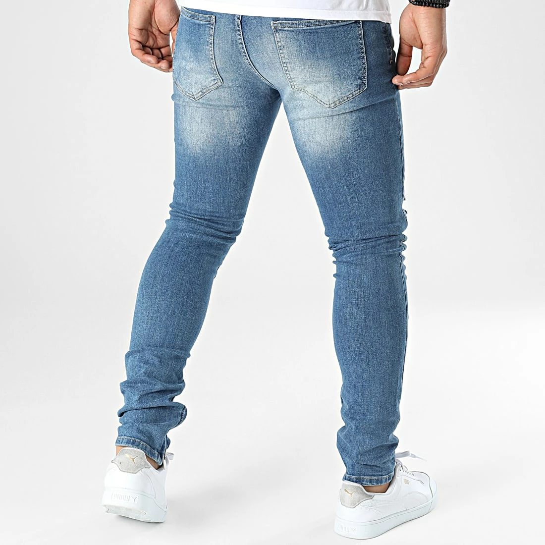 • Jean skinny tendance finition tachée, usée et délavée avec rapiéçages
